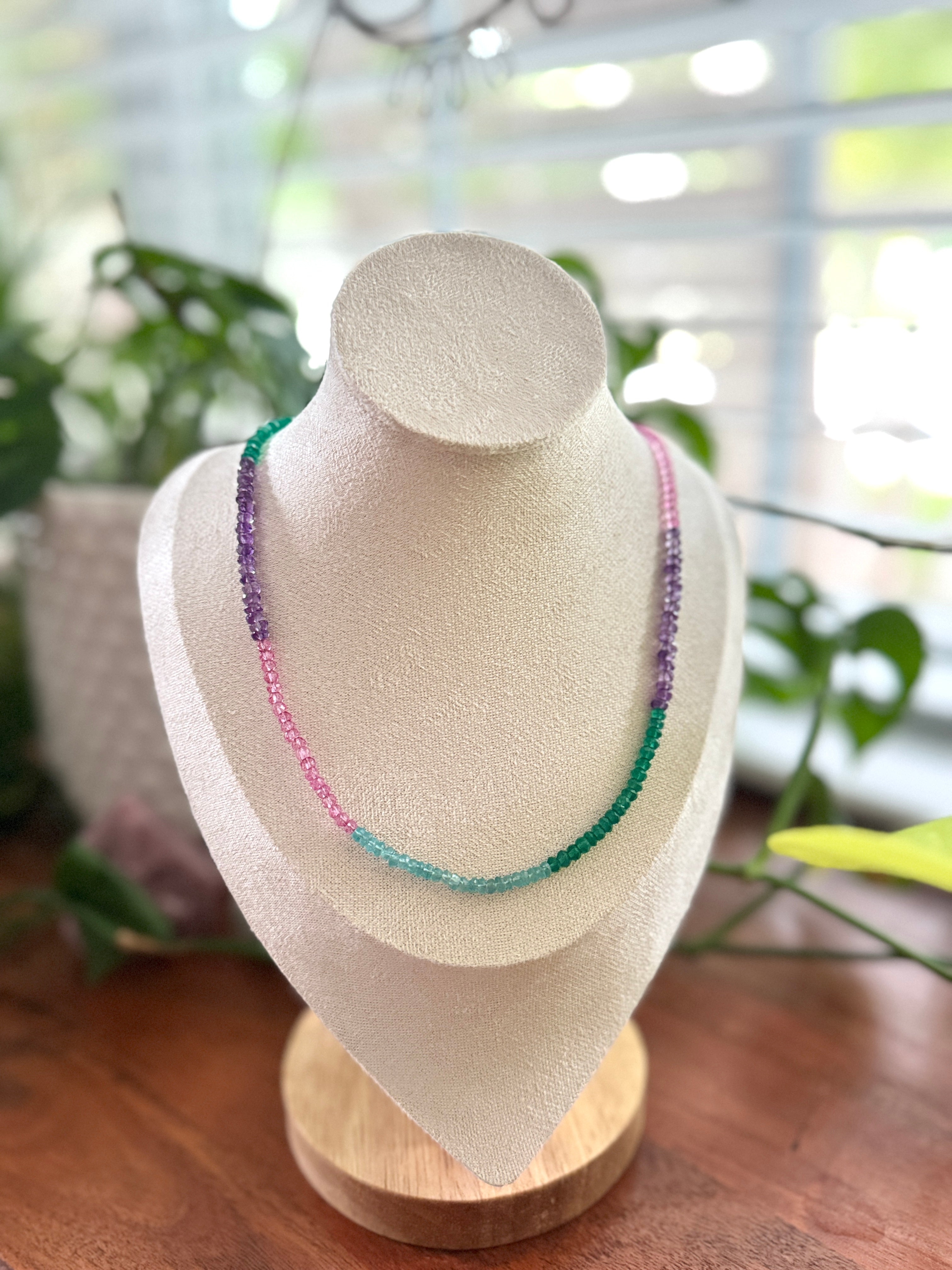 This handmade, one-of-a-kind beaded gemstone necklace features a rainbow of lovely jewel tones with purple amethyst, green onyx, pink topaz and light blue apatite.