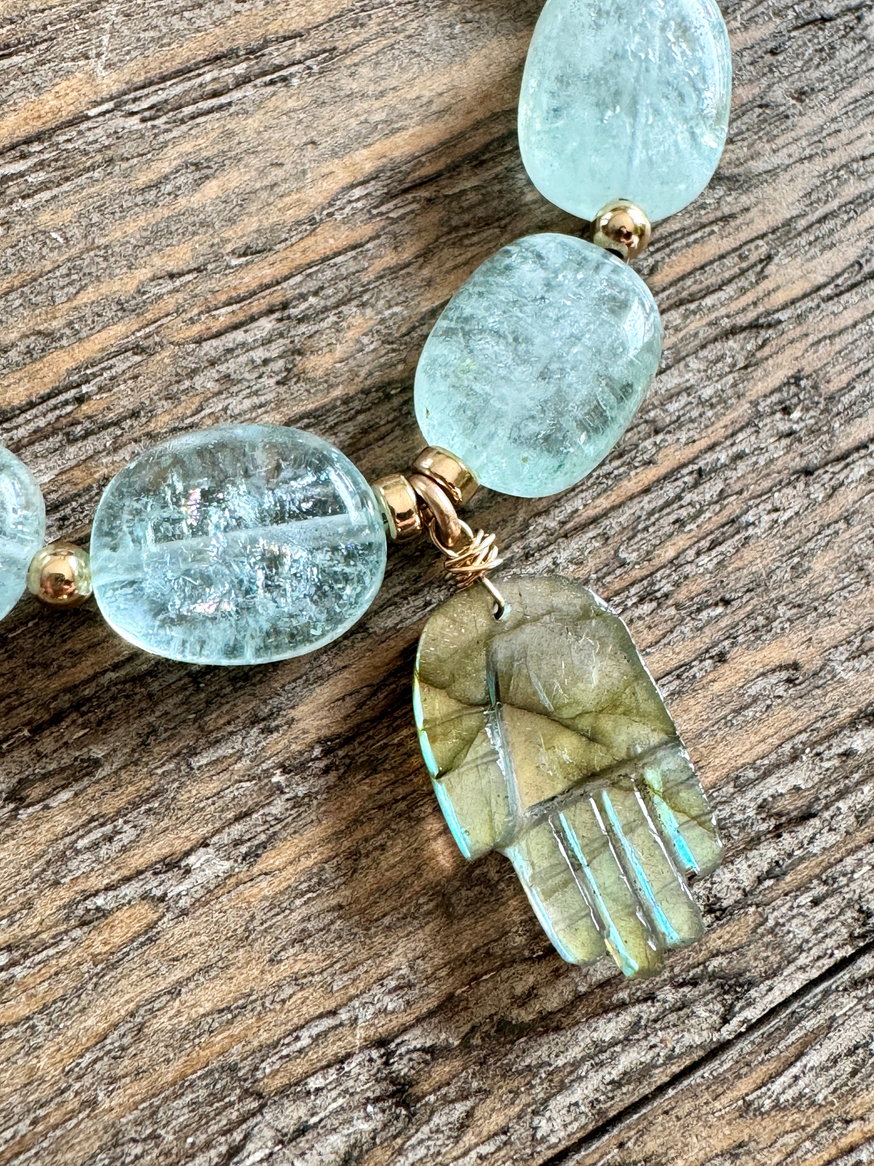 Aquamarine Bead Labradorite Hamsa Charm Statement Necklace