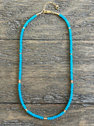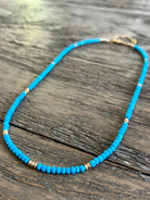 This handmade, one-of-a-kind beaded gemstone necklace features gorgeous, Arizona turquoise rondelle beads, spaced with 14k gold-filled barrel beads and 14k gold-filled stardust beads. A matching 14k gold-filled lobster clasp and extender chain complete the piece.
