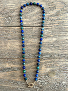This handmade, one-of-a-kind beaded gemstone necklace features gorgeous faceted malachite, azurite and chrysocolla beads, which occur together in nature.