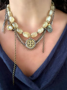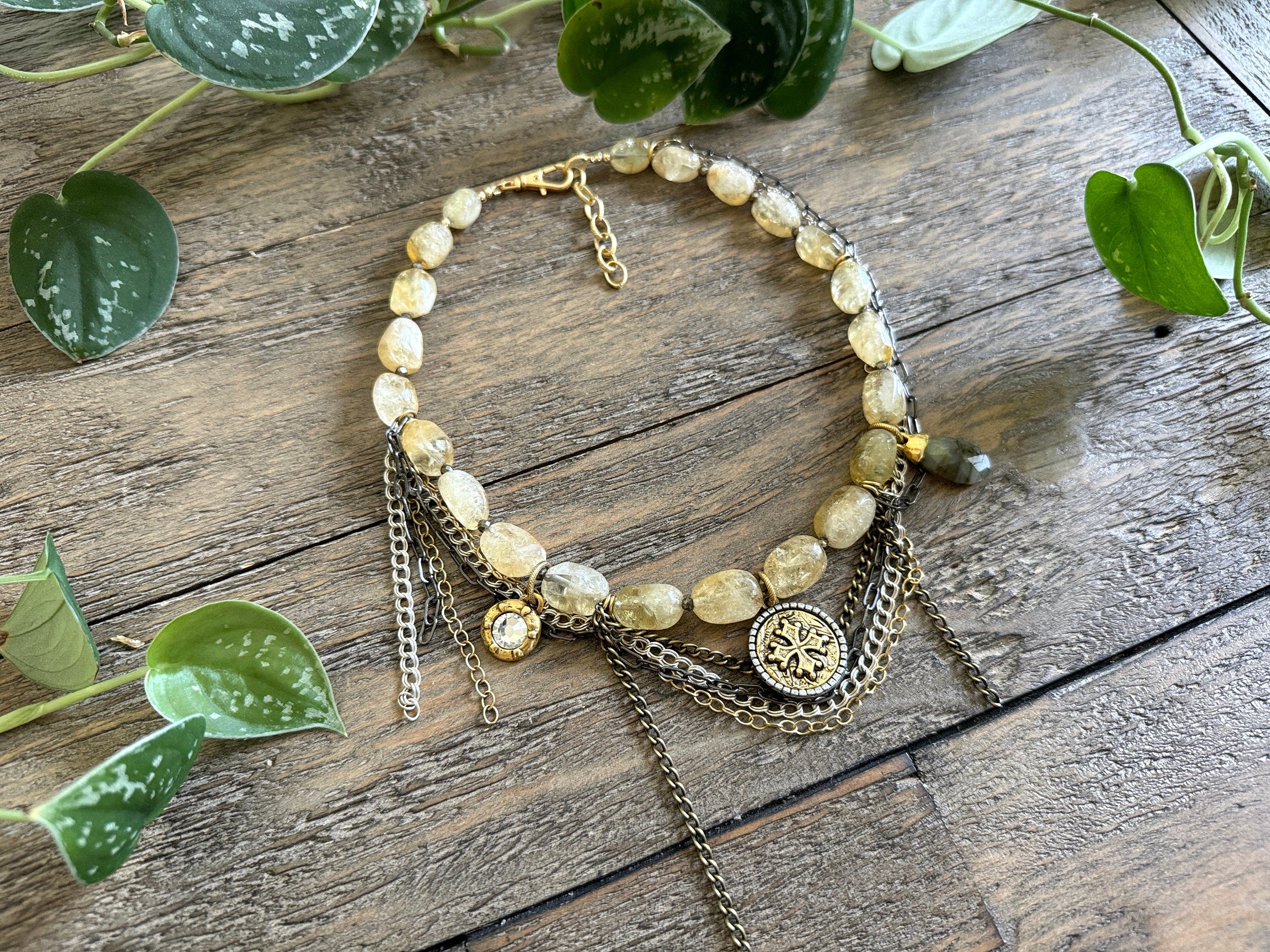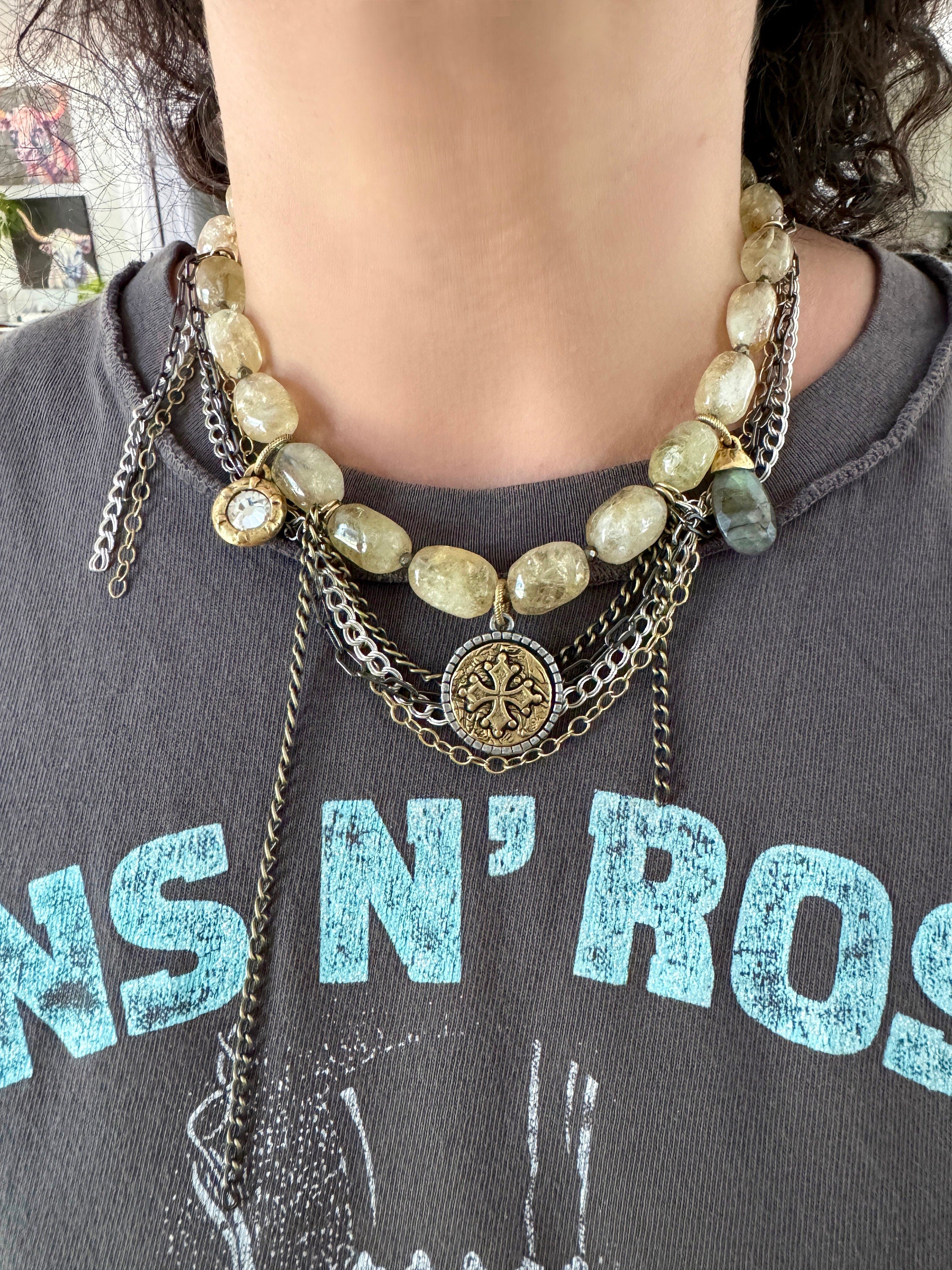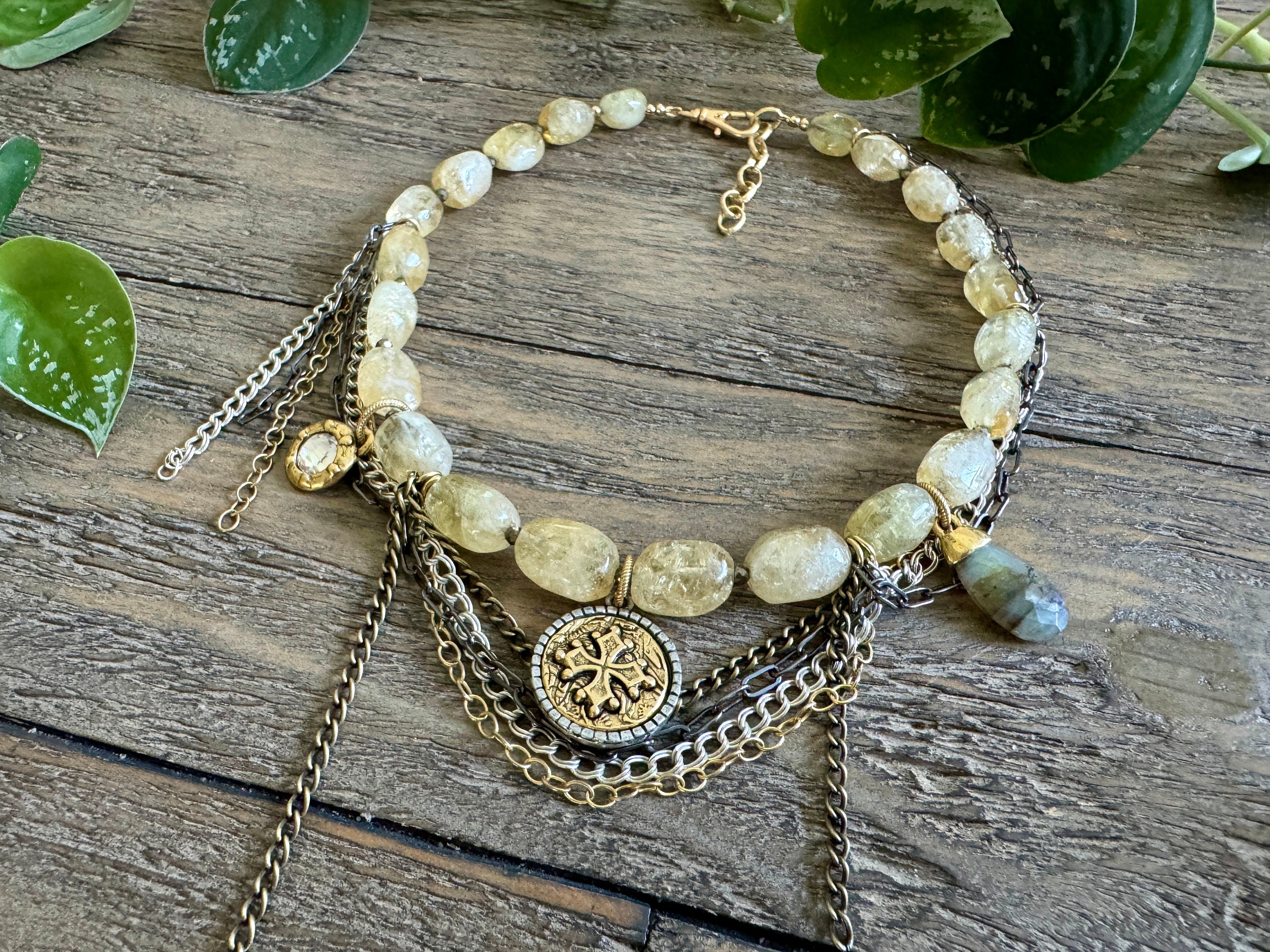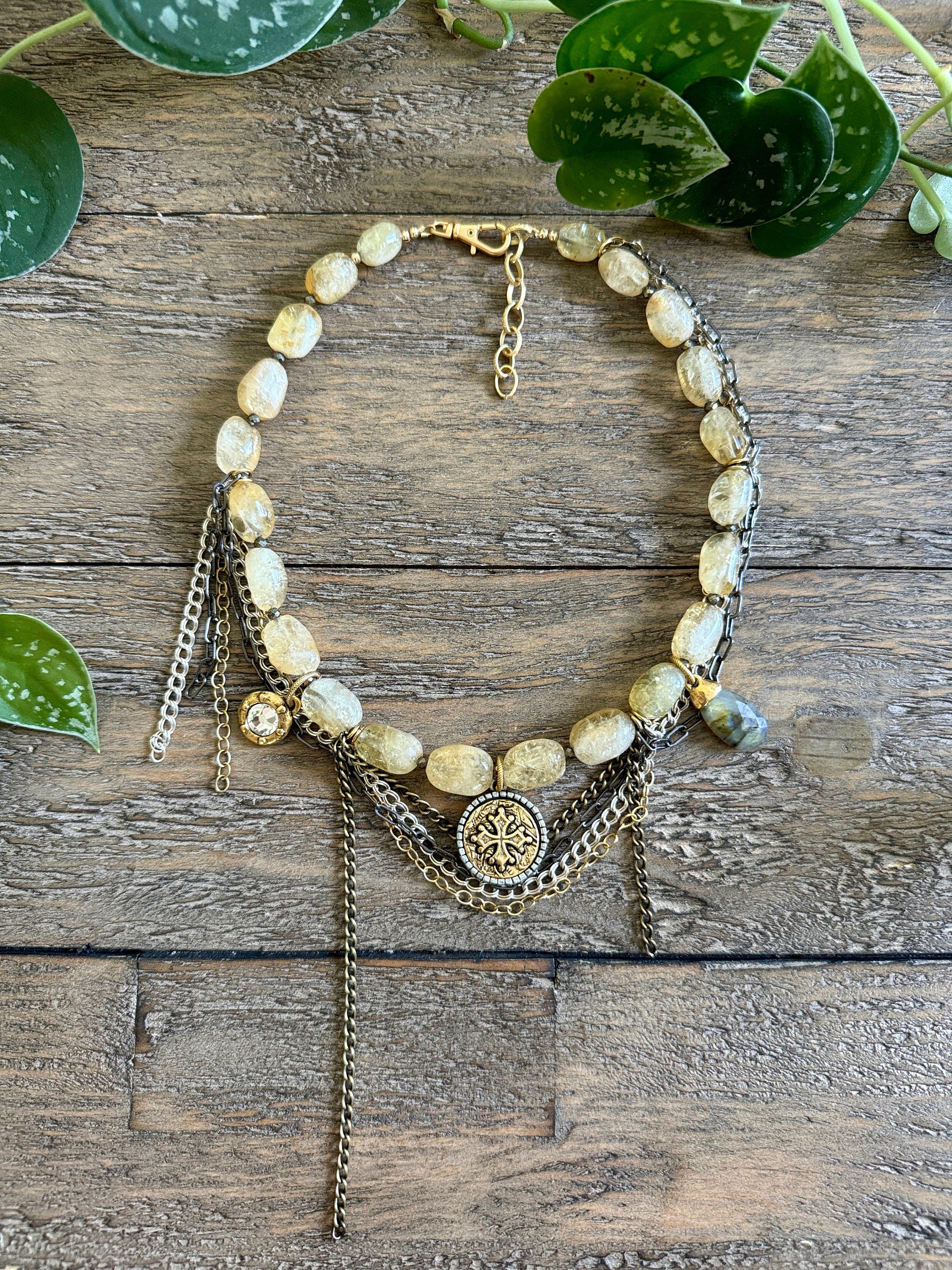 Citrine Bead Cross Charm Hanging Chains Statement Necklace