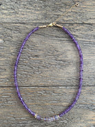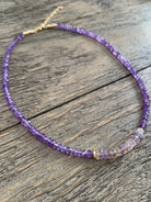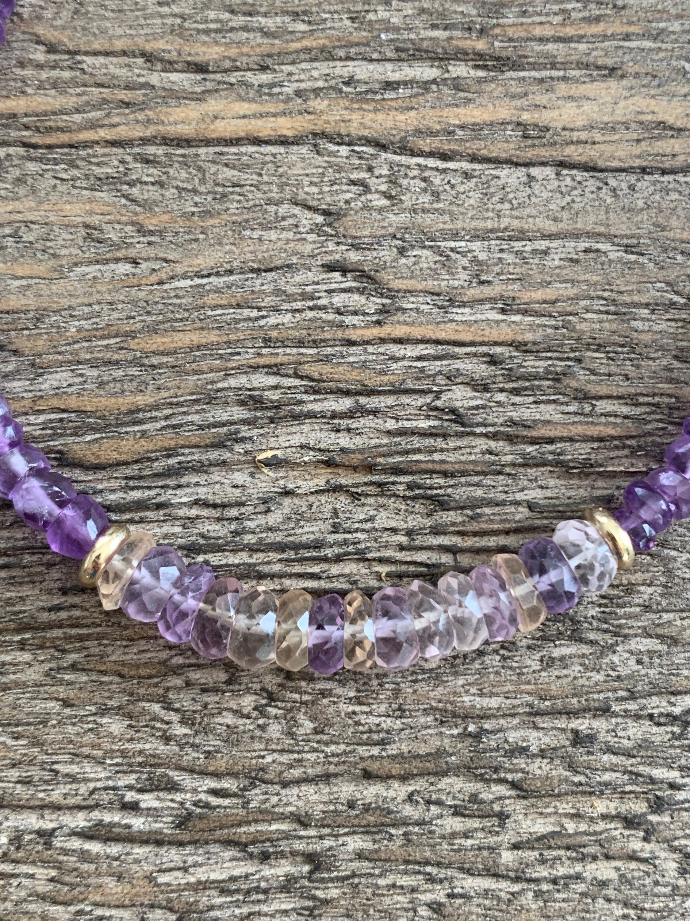 14k gold-filled beads separate the amethyst from the ametrine bib in the front, and the piece fastens with a 14k gold-filled lobster clasp and finishings.
