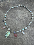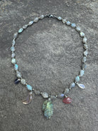 Carved gemstone charms include: a labradorite hamsa, fluorite moon, iolite star, chalcedony lips and moonstone leaf.