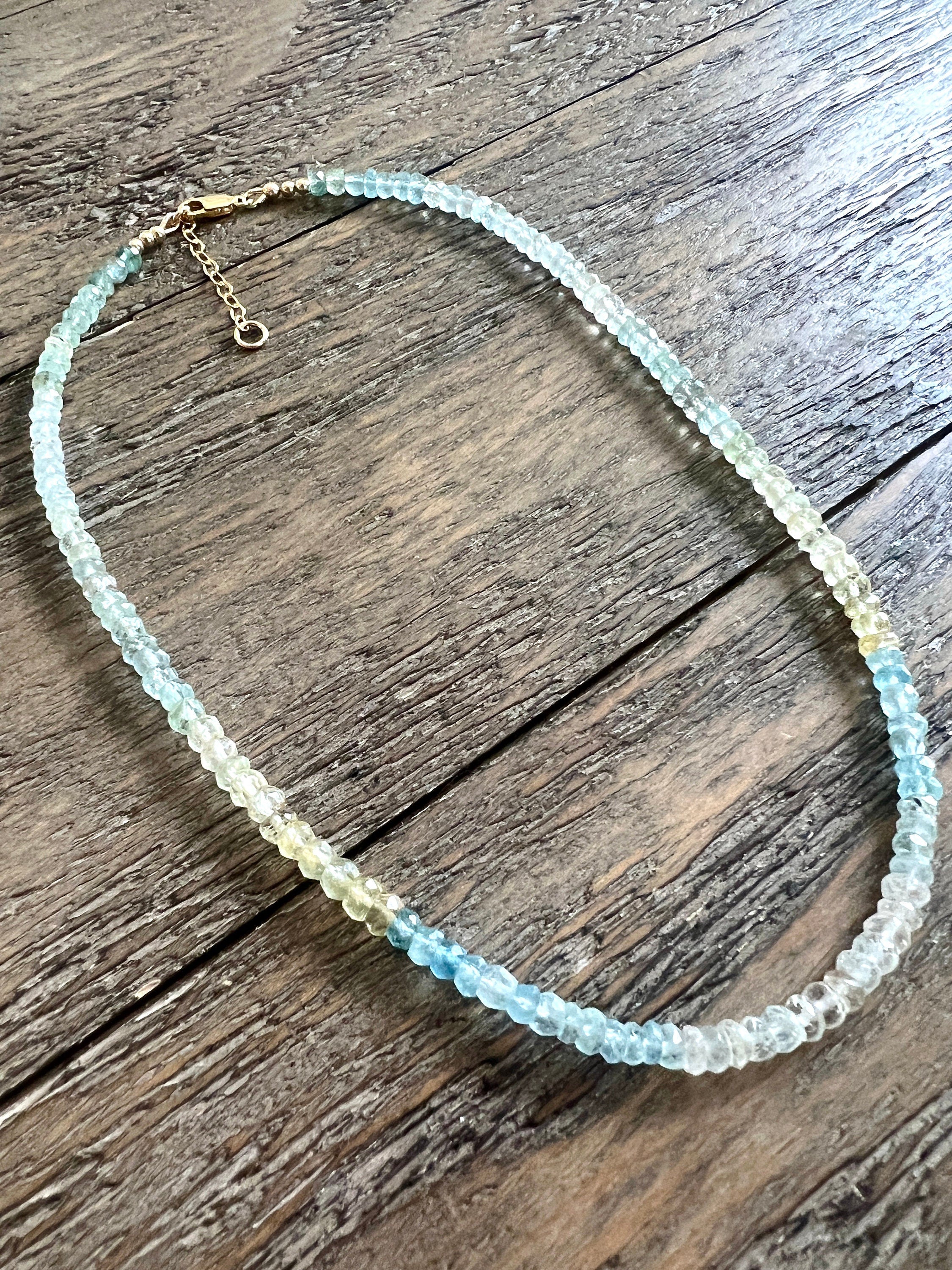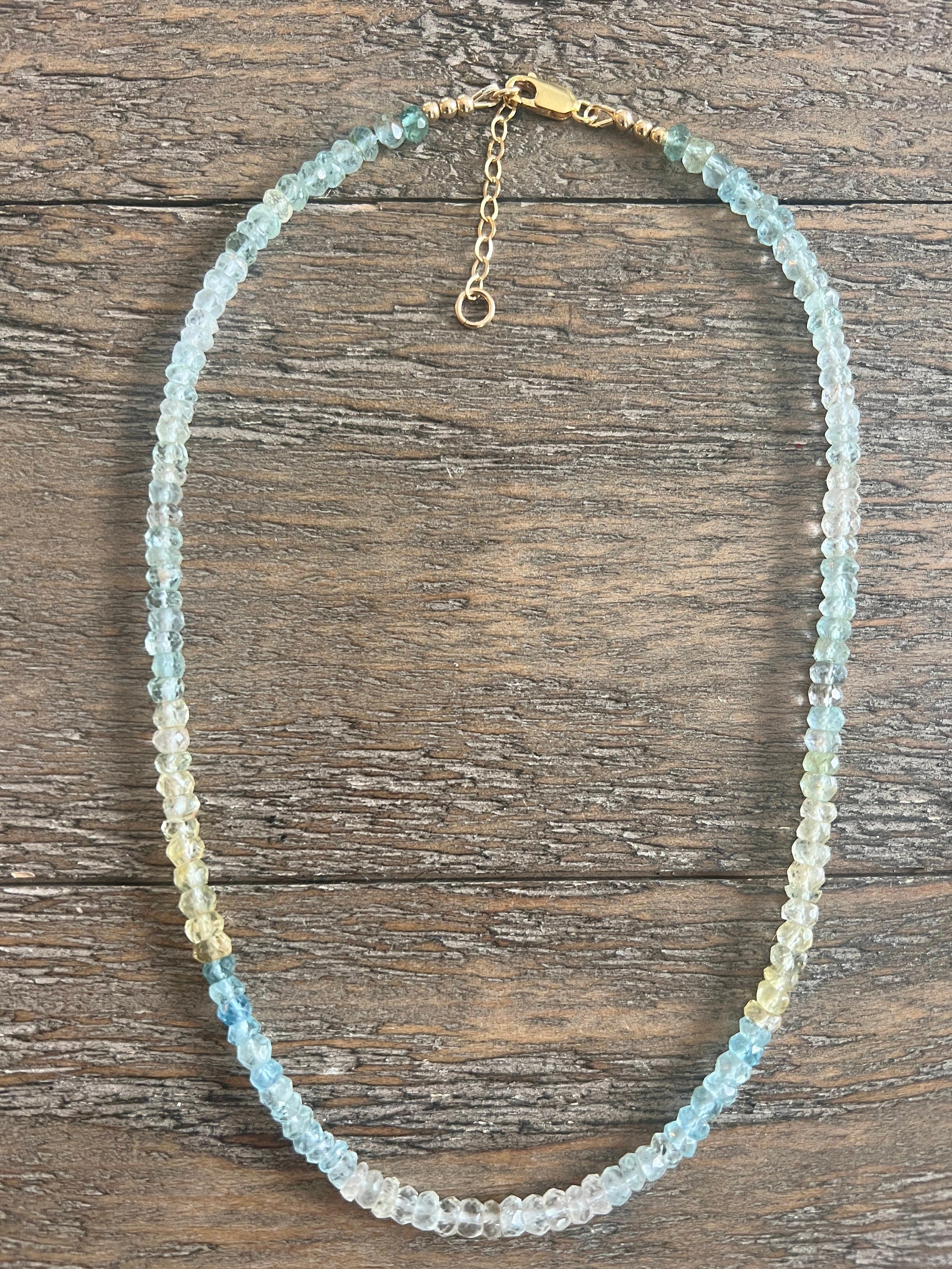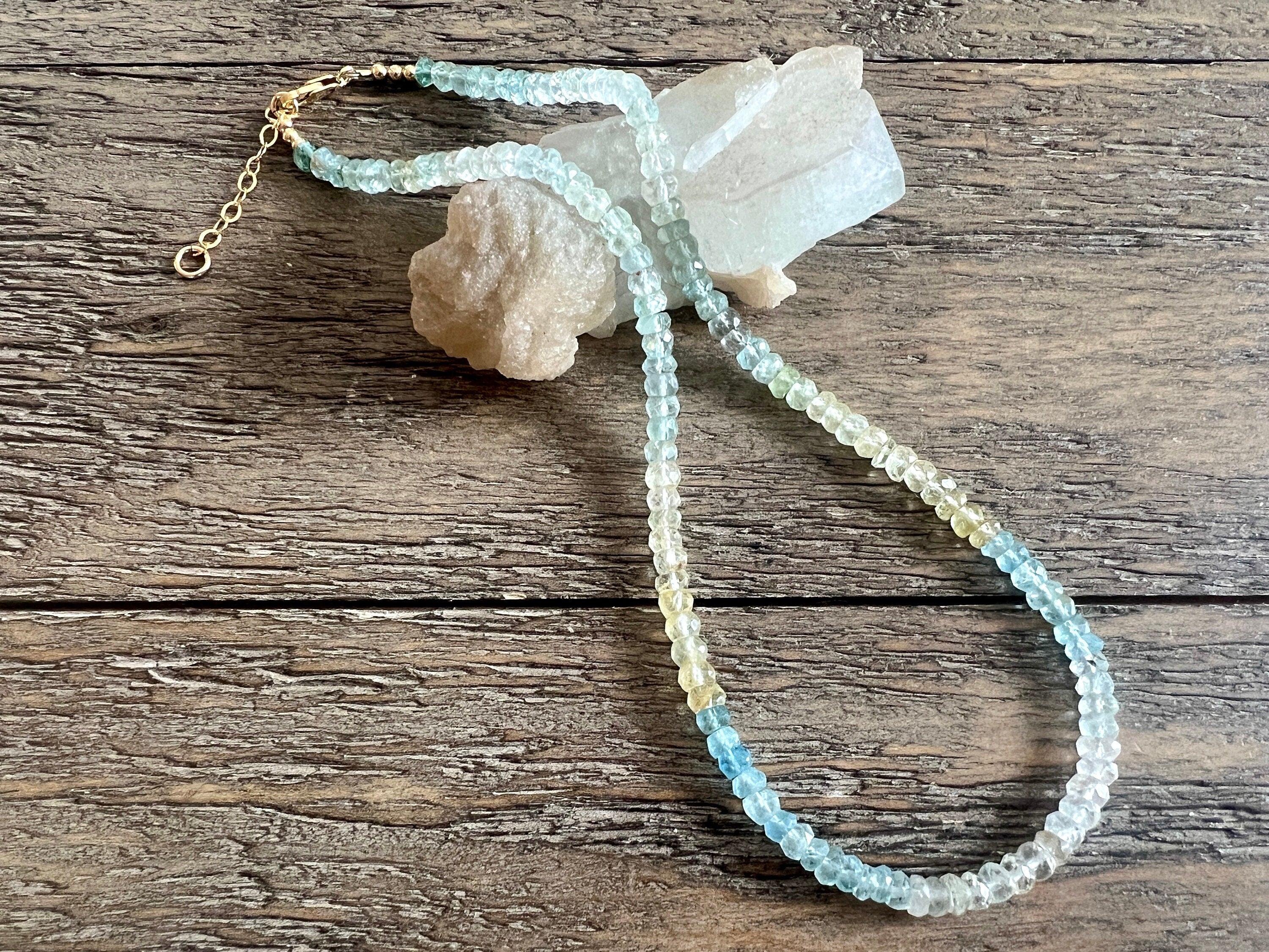 This handmade, one-of-a-kind beaded gemstone necklace features pastel morganite aquamarine, with a 14k gold-filled lobster clasp and chain extender.