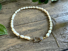 This handmade, one-of-a-kind necklace features beautiful, white freshwater baroque pearls, spaced with 18k gold vermeil/sterling silver beads.